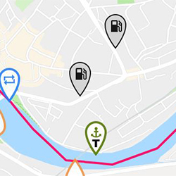 Nach Klick auf das Abzweigungssymbol erhalten Sie den Namen der beiden Flüsse, sowie die Entfernung und die benötigte Fahrtzeit bis zu diesem Ort. Das Symbol wird auch eingeblendet, wenn sich nur der Flussname auf der fortlaufenden Route ändert.Distanzen und Fahrzeiten